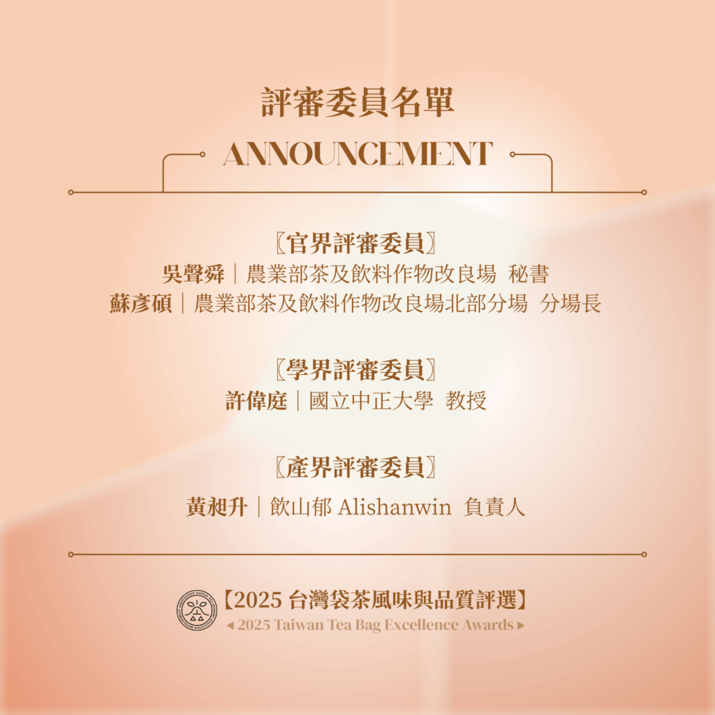 為確保評選的公正與專業,本次特別邀請來自 產、官、學 三界的茶葉專家擔任評審,齊聚一堂,為台灣袋茶品質把關: