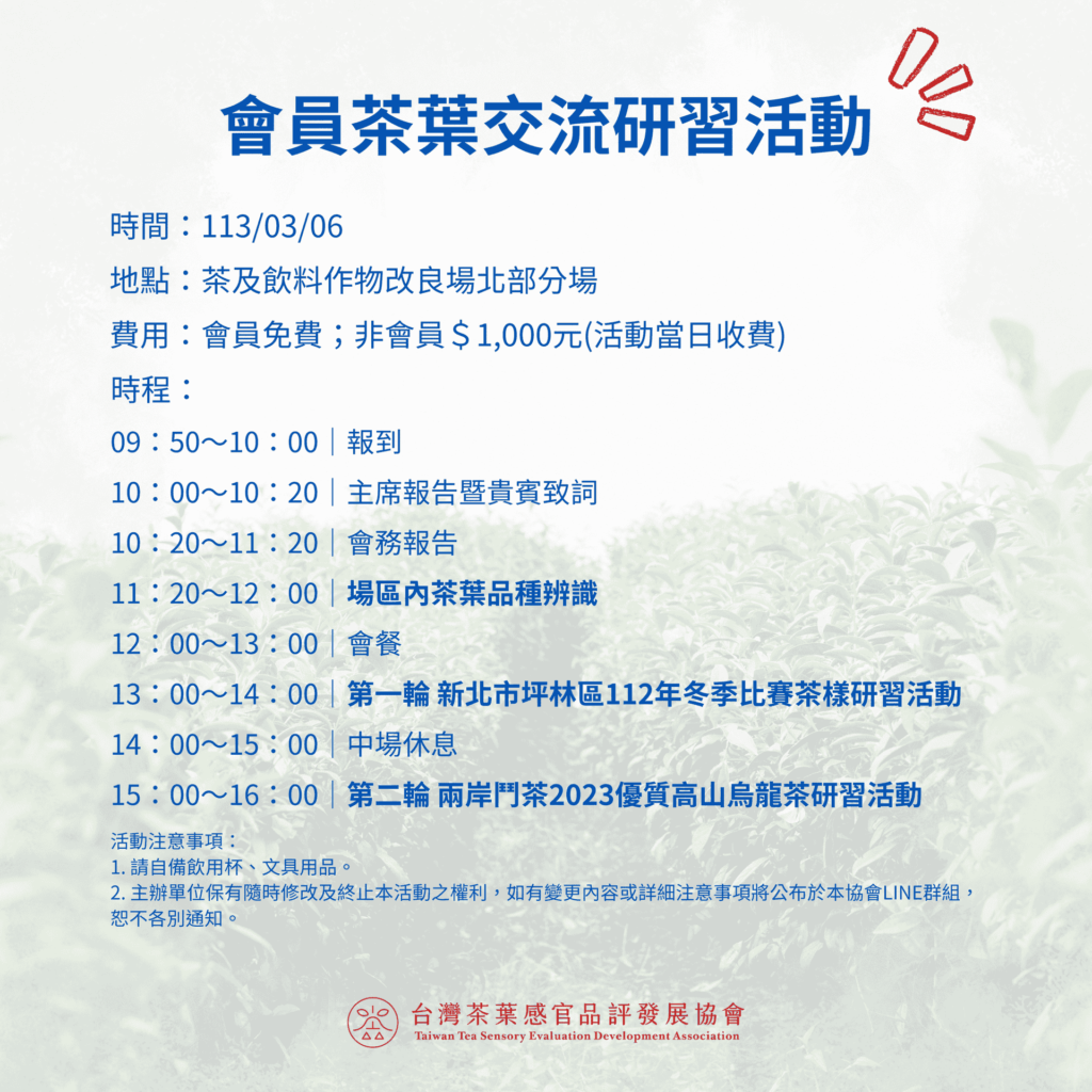 本次活動是協會特別為會員舉辦的交流研習活動,希望藉此機會讓大家能夠增進茶葉知識,並相互交流心得。